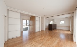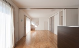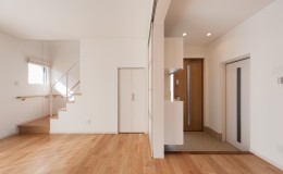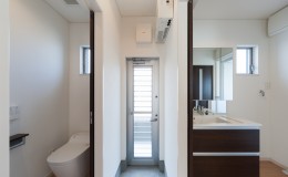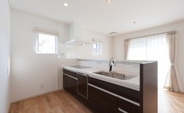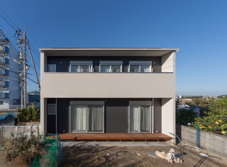 外壁はシンプルな色合いの2トーンカラーで落着いた印象に。内部も白を基調にまとめ、洗面台やキッチンのブラウンが引き立っています。