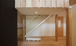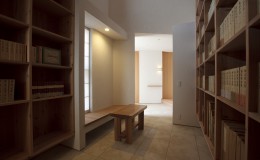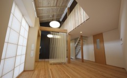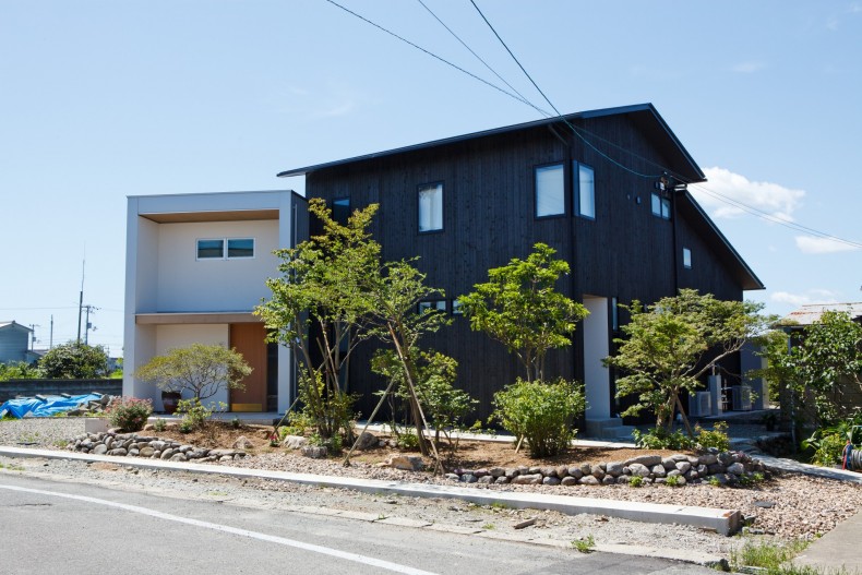 外壁は焼杉を使用。シックな印象の中に木の木目がいい味を出しています。玄関直ぐにある背の高い本棚部分は、大好きな本に囲まれて自分だけの空間に。吹抜けの空間も開放感があります。