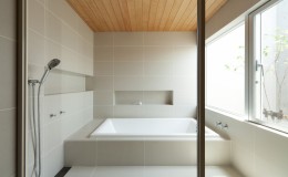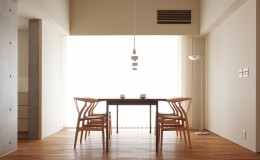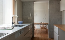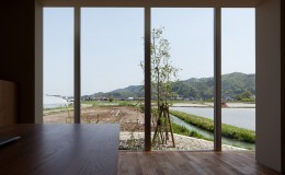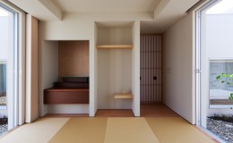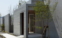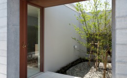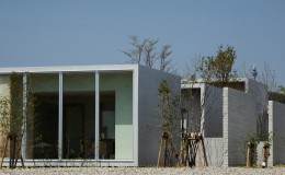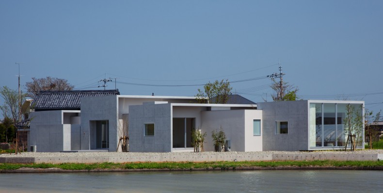 打放しコンクリートが目を引く平屋建て。いくつもの箱が並んでいて立体的な奥行きを感じさせます。それぞれの場所から見える違った景色が、日常の中の四季をより強く感じさせてくれます。
